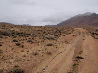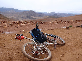 Reagrupamos y aprovechamos para comernos el bocata, la organización nos da todos los días una bolsa con una pieza de fruta, un bocata, y un par de barritas y un gel gentileza de Infisport http://www.infisport.com/index.php. Afrontamos el descenso que es rápido y facil. A continuación tomamos un desvío a la derecha y seguimos un camino en constante y suave ascenso, En esta zona nos cruzamos con numerosas escorrentías secas y pedregosas. Sería un camino rápido si no fuera por el barro que lastra nuestras ruedas. Poco a poco nos acercamos al final de la etapa y a las cimas del Djebel Saghro nevado.